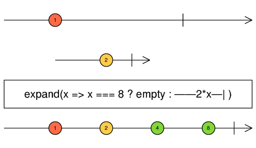 expand 将传入的 Observable 工厂进行递归操作。与上面的复合映射类似,expand 也是一种复合映射,只不过,他会不断的去复合下游流的数据,也就是类似上图的模式。