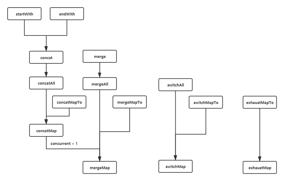 上一篇中,关于 concat 和 merge 两个相关的 operators 并没有讲到,因为这它们其实最终都是调用 mergeMap。