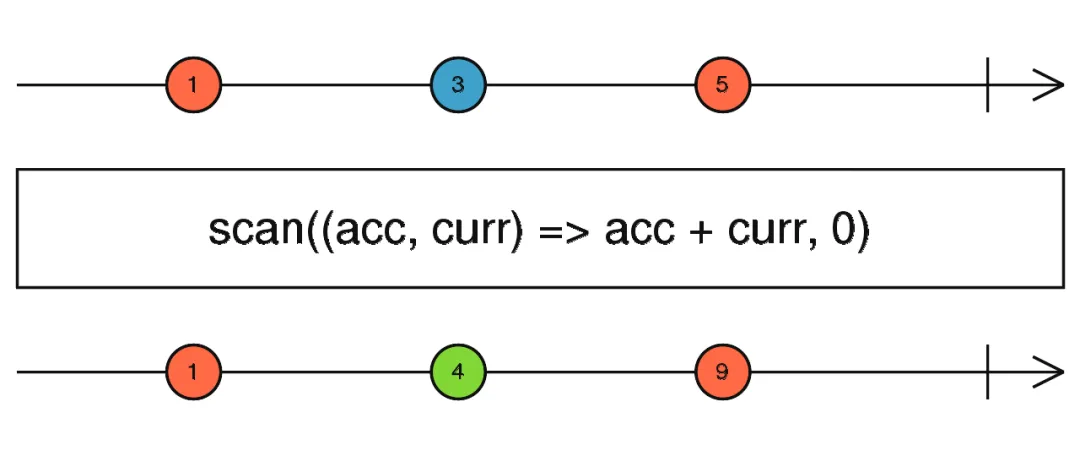 Scan 和 的作用跟 reduce 一样,传入一个函数把一组数据打平,但是跟 reduce 不一样的点在于,每一次结合完毕都会立刻返回结果。